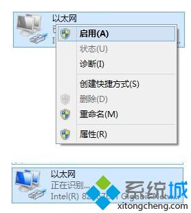 2、当图标显示灰色的时候再右键点击,启用然后回到桌面,网络就会自动重新配置。
